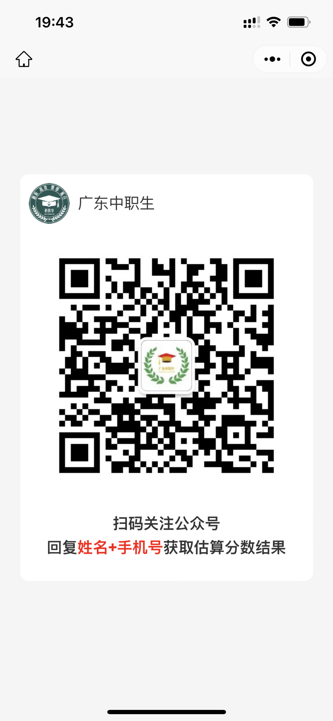 长按图片二维码,识别关注【广东中职生】公众号。回复“姓名+手机号”,如“王明+13111111111”或者“王明13111111111”,两种回复形式,获取估算分数结果。