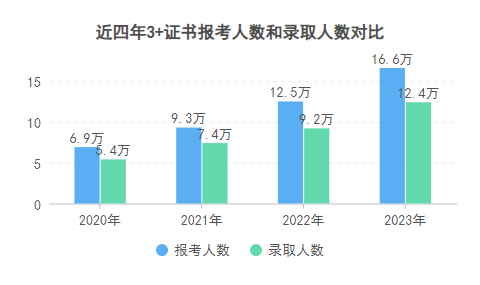 政策支持:2019年要求招生计划不低于本校申报的年度总招生计划的15%,2020年起3+证书计划不能低于总计划20%,2023年提升至25%,相信未来高等院校对3+证书招生计划会越来越多。