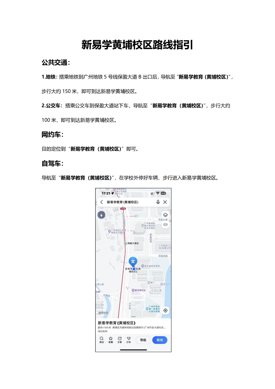 交通便利。新易学培训基地黄埔校区位于广州市黄埔区,地理位置优越,交通便利。学校距离广州地铁5号线保盈大道站B出口仅150米;公交广368、广369、广378、B28、B29等均可直达学校。