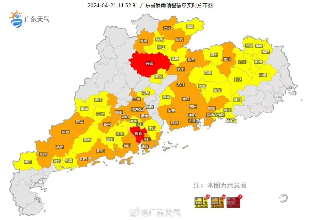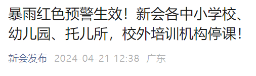 中午12:38,新会发布官微发布通知,新会区气象台于2024年4月21日9时51分将暴雨橙色预警信号升级为红色,根据《广东省气象灾害防御条例》规定,新会区所有中小学校、幼儿园、托儿所、校外培训机构等,在红色暴雨预警生效期间停课