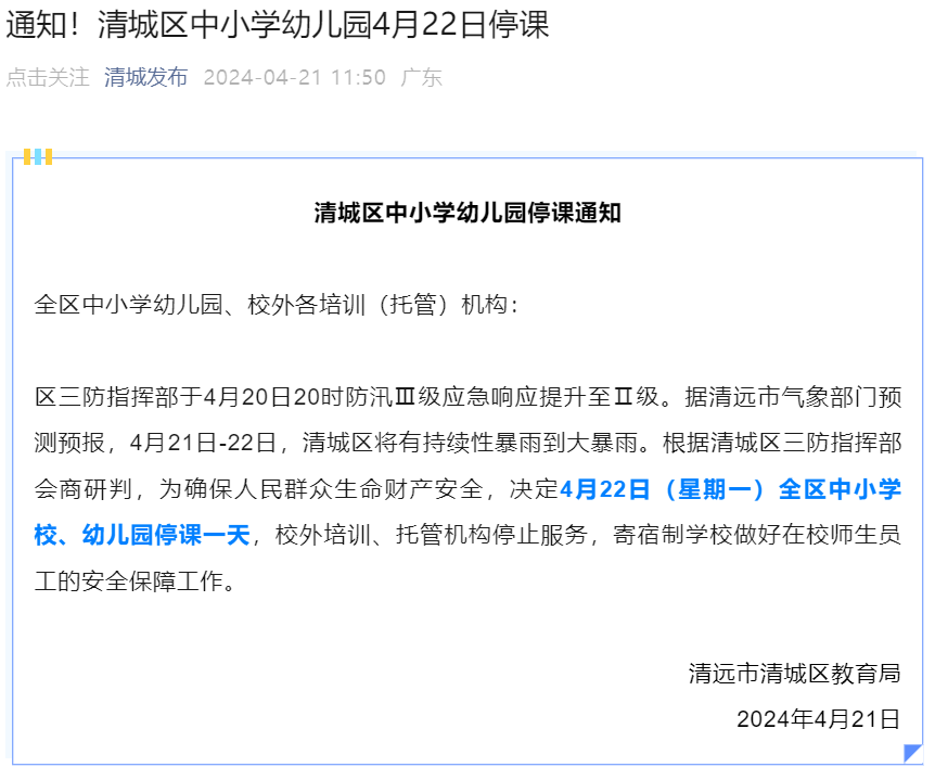 中午11:50,清远市清城区教育局发布通知,4月22日(星期一)全区中小学校、幼儿园停课一天。