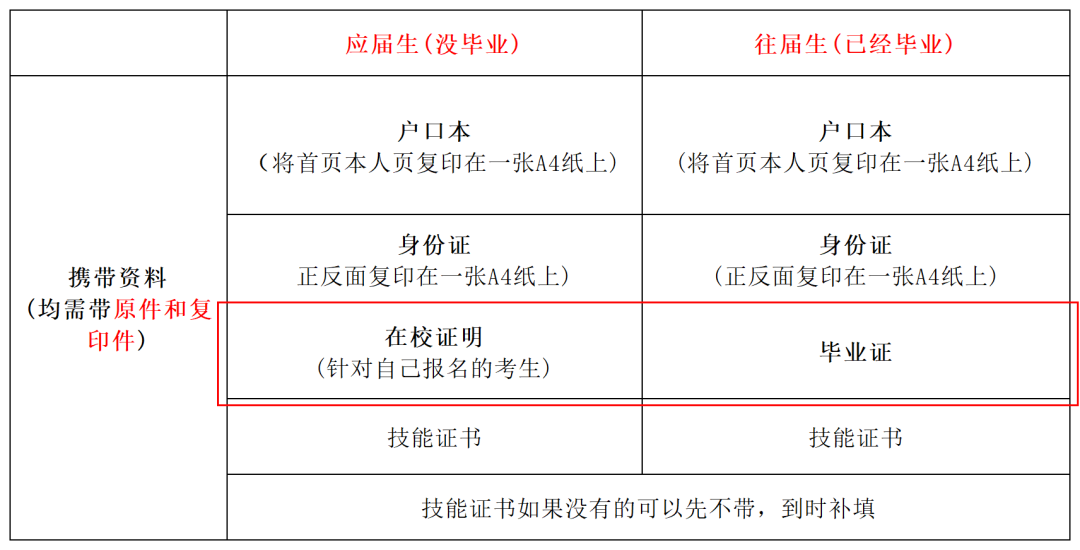 往届毕业生、社会考生须持身份证、户口簿、中职毕业证、技能证书(没有可先不带)这几样的原件+复印件到户籍地教育局指定的报名点办理报考手续,由报名点派发考生号。