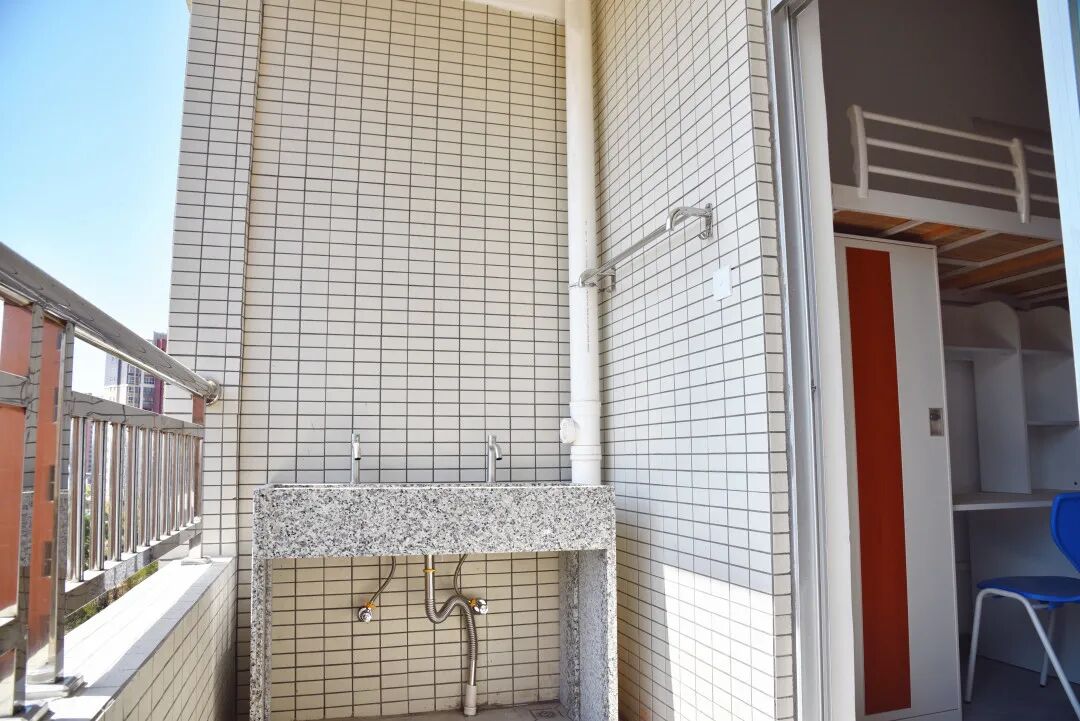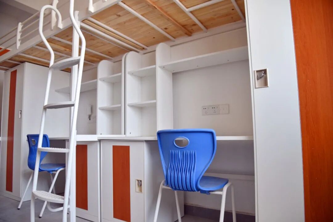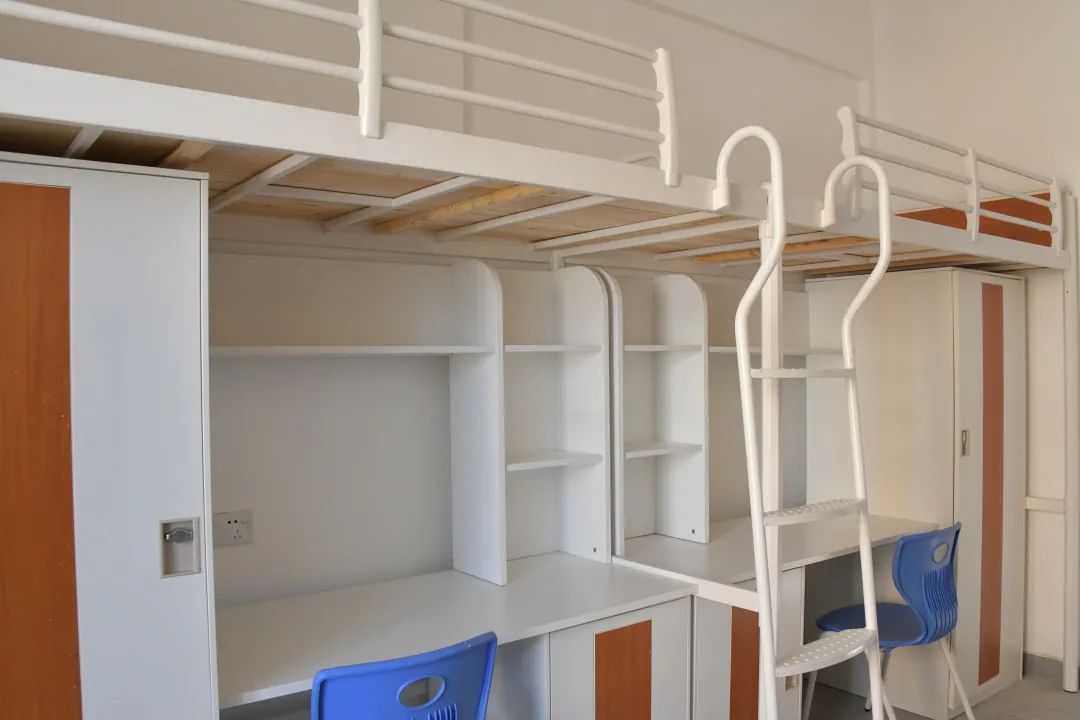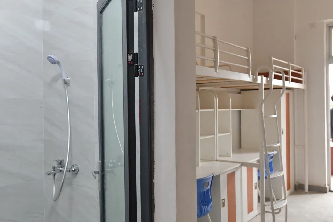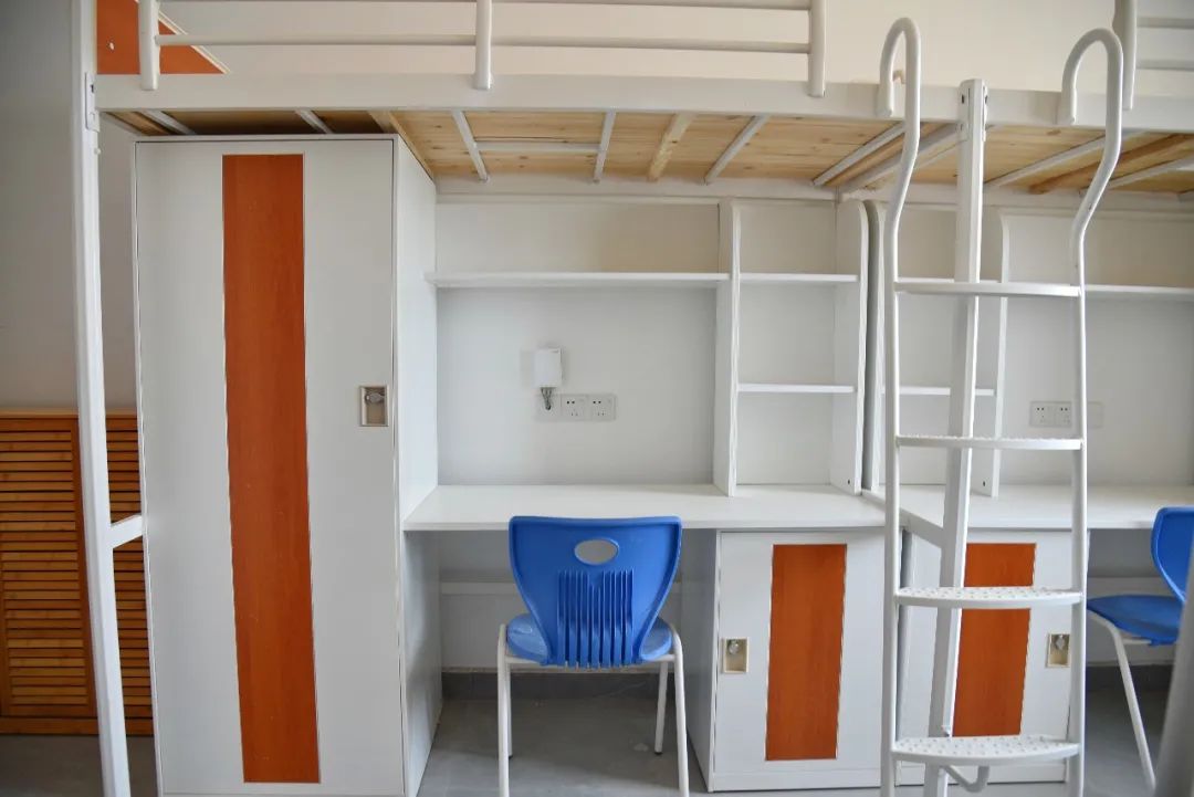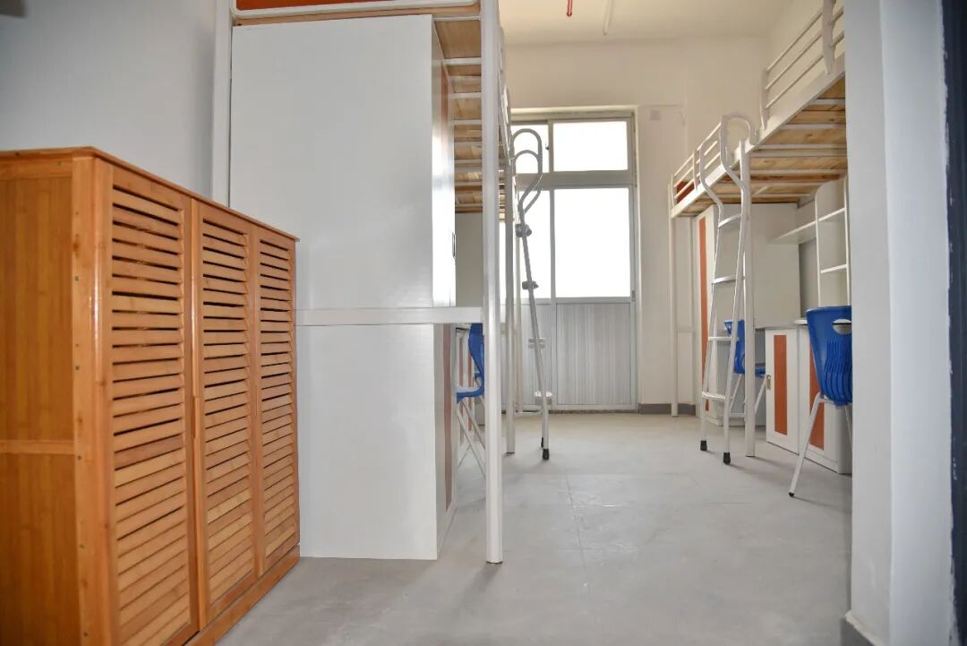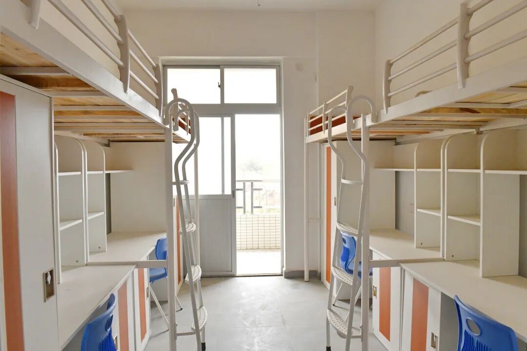 每间宿舍4人居住,配套组合式家具(衣柜、书桌、鞋柜),独立卫生间及生活阳台,统一装配空调(将于近期安装完毕)、风扇。