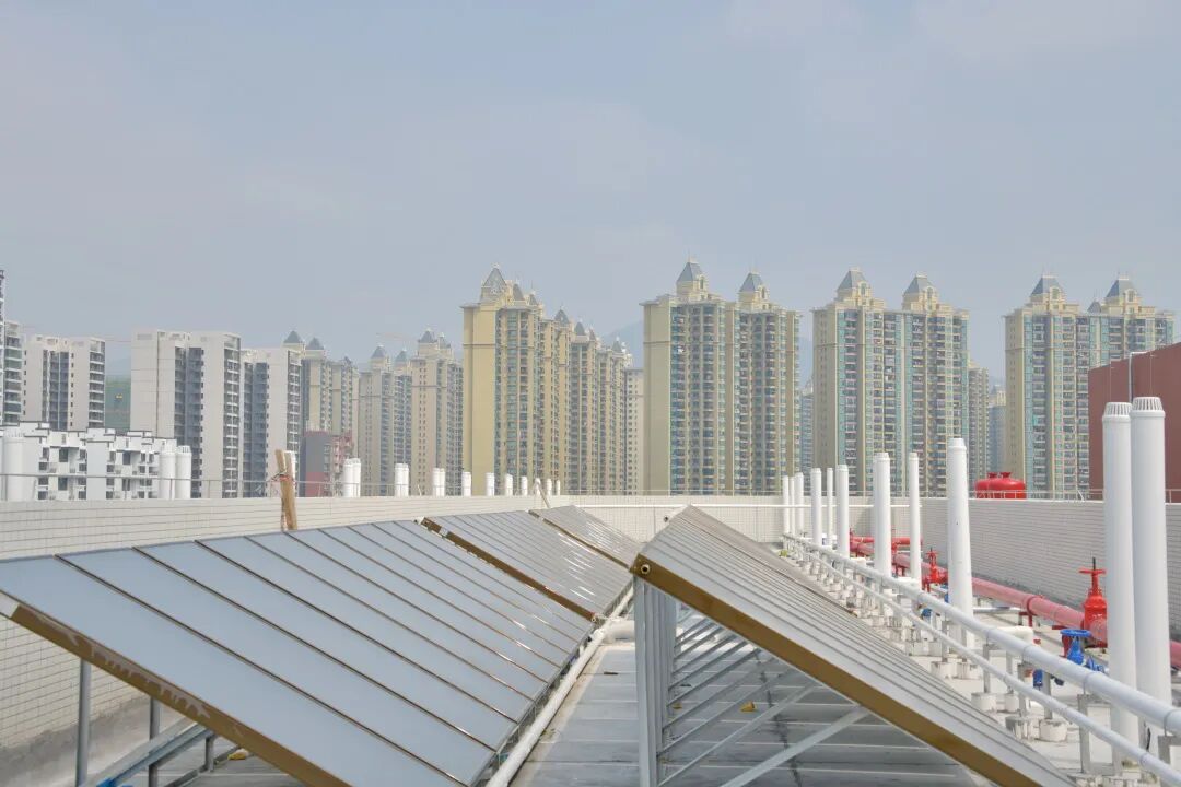 楼顶布置水池、太阳能等各类生活设施,全新热水系统满足全天24小时热水供应,并有效遮挡阳光,改善顶层宿舍夏天的舒适程度。