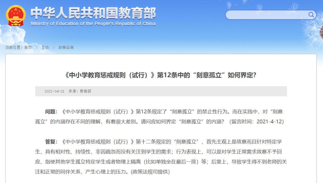 3月1日起,《中小学教育惩戒规则(试行)》(点击查看详情,下文简称《规则》)正式施行。近日,有网友在教育部网站咨询,《规则)》第12条中的“刻意孤立”如何界定?教育部的答复引发关注!