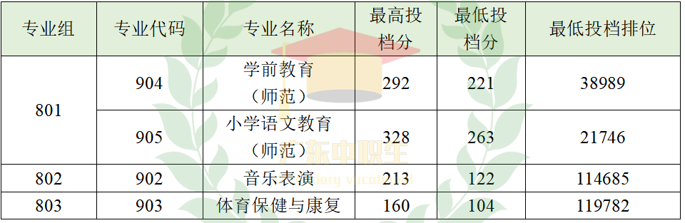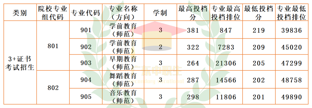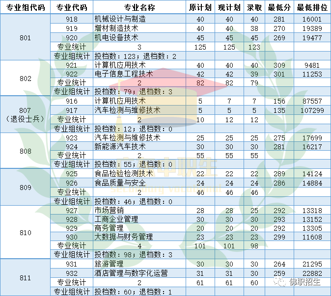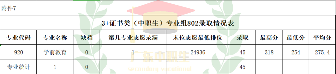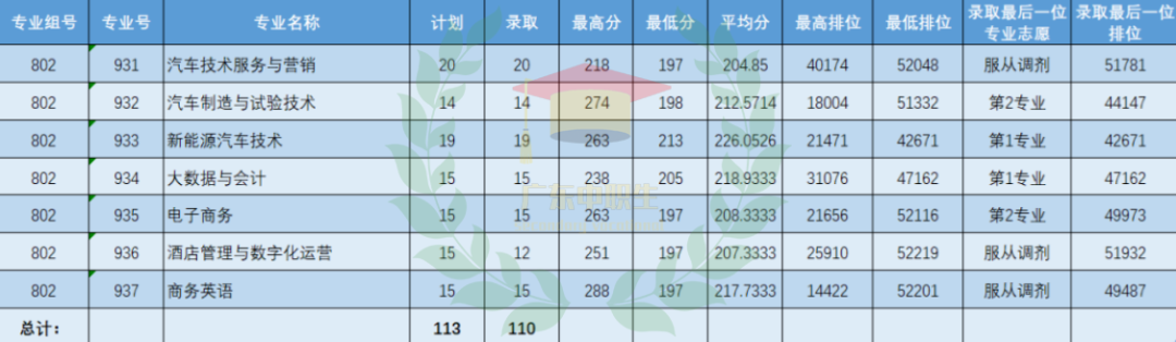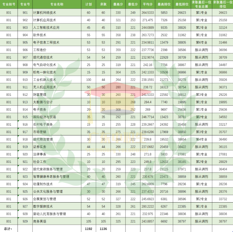 3+证书普通类专业组802:招生计划45人,出档45人,最低投档分254,最低排位24936。录取45人,退档0人。各专业录取情况见附件7。