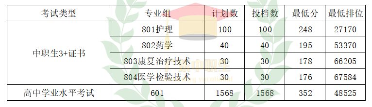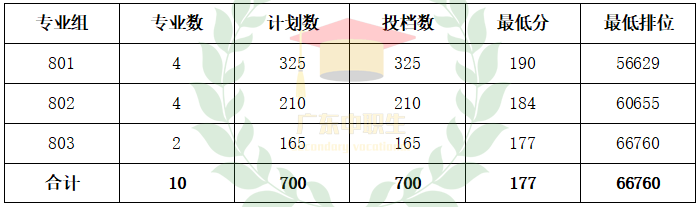 今年我校“3+证书”类招生专业10个(分为专业组801、802、803),计划录取700人,投档700人,一次性满档。投档最高分321分,最低分177分,同比去年提高19分,比全省专科最低控制线(100分)高出77分,考生最低排位66760名,详见如下。