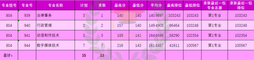 3+证书普通类专业组804:招生计划20人,出档20人,最低投档分155,最低排位87719。录取20人,退档0人。各专业录取情况见附件9。