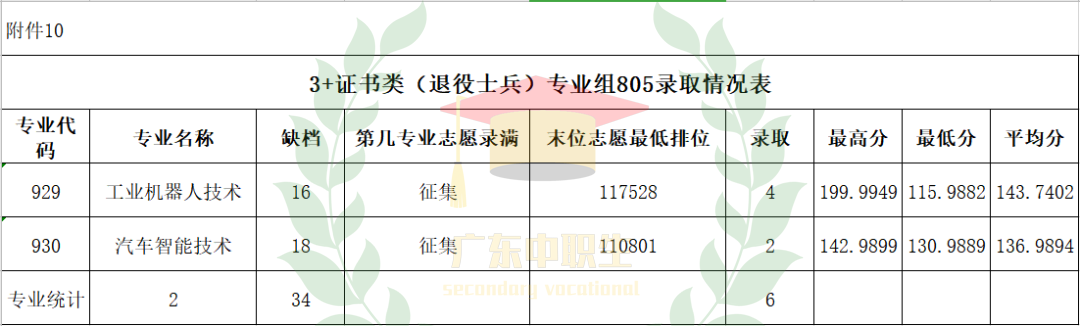 3+证书退役士兵组805:招生计划40人,出档6人,投档最低分116,最低排位117528,录取6人,退档0人。各专业录取情况见附件10。