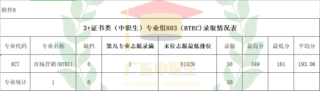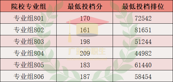 3+证书普通类专业组803:招生计划50人,出档50人,最低投档分161,最低排位81529。录取50人,退档0人。各专业录取情况见附件8。