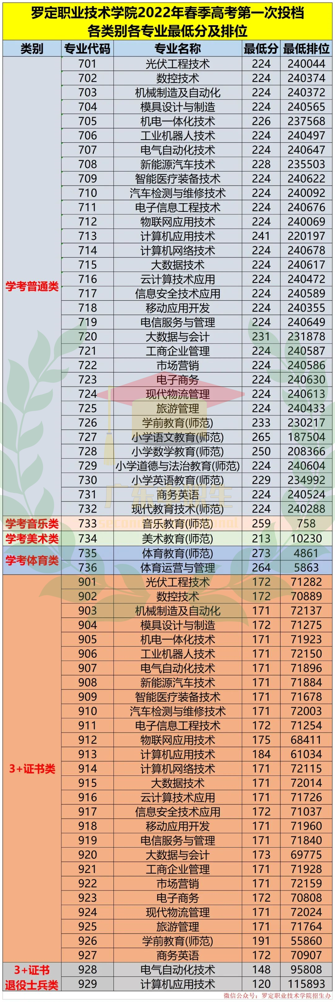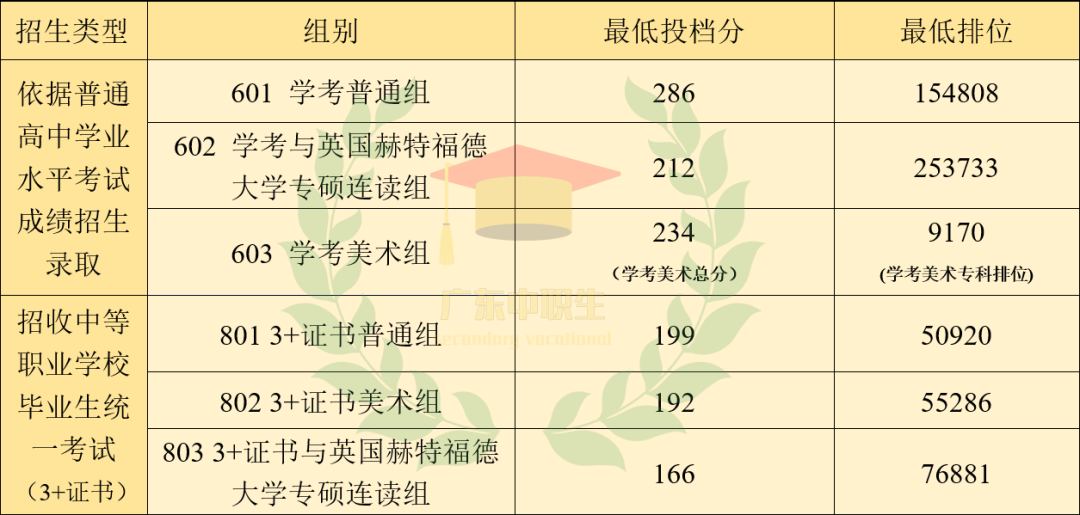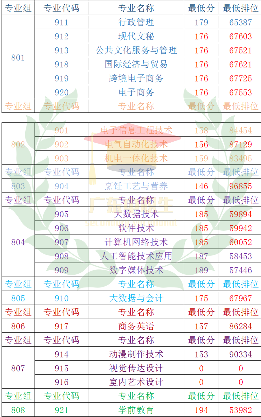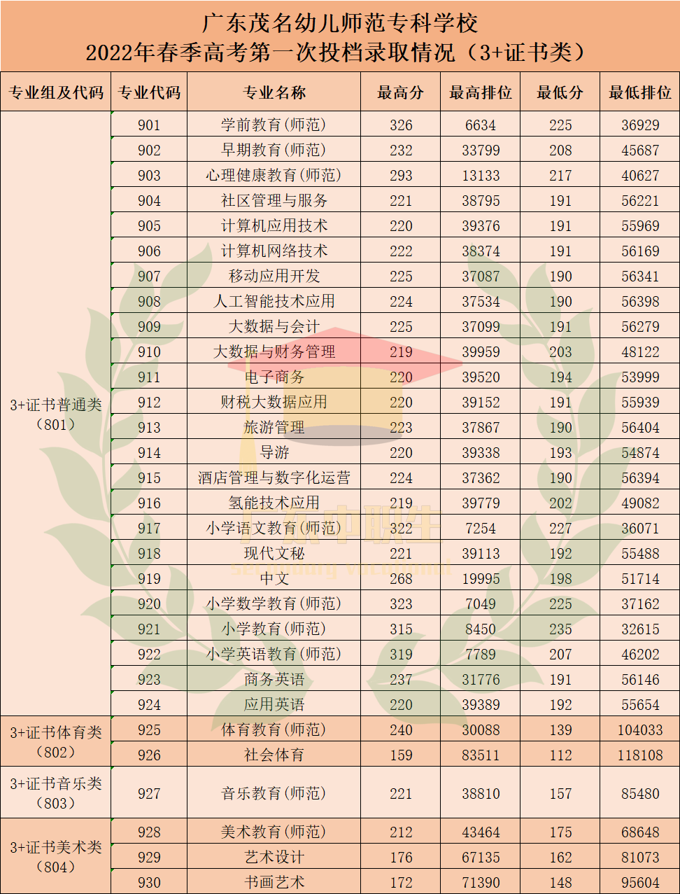 根据广东省教育考试院2022年春季高考招生录取工作安排,目前,第一次投档录取工作已基本结束,我校共录取2647人。今年报考我校生源非常充足,大部分专业组一次性满档,师范类专业依然深受考生青睐,其中3+证书类别录取最高分326分。为方便考生及早查询到录取结果,现将我校各类别各专业的录取最低分、最低排位公布如下: