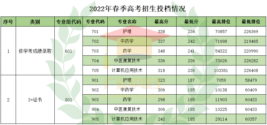 根据广东省2022年春季高考招生录取投档情况,广东云浮中医药职业学院首次春季高考招生的5个专业受到广大考生热捧,“依学考”和“3+证书”均一次性满档。