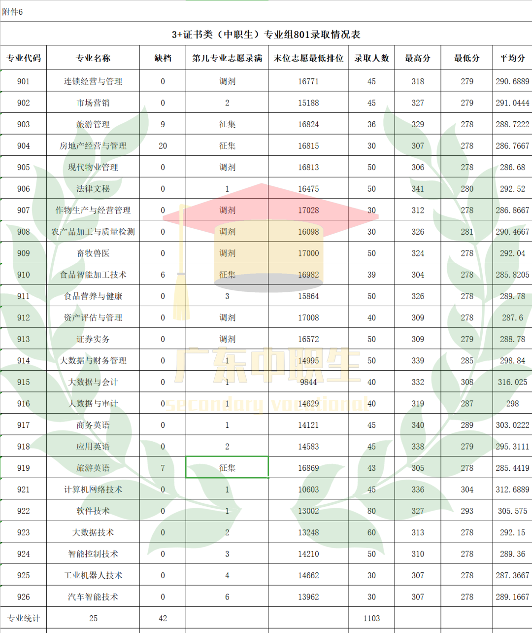 3+证书普通类专业组801:招生计划1145人,出档1145人,最低投档分278,最低排位17028。录取1103人,退档42人,退档原因:不服从专业调剂。各专业录取情况见附件6。