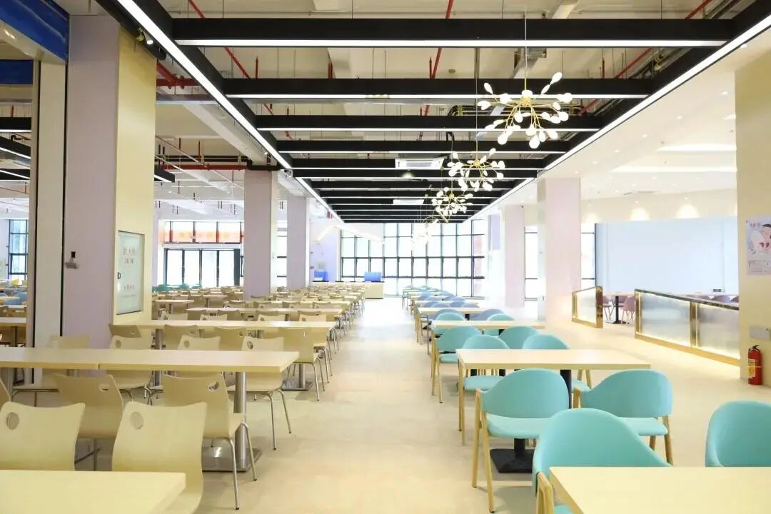 康康清远校区的食堂,舒适多彩的餐椅,圆桌长桌满足学生们的不同需求。周围散落着几株绿植,为食堂增添了几分生气。