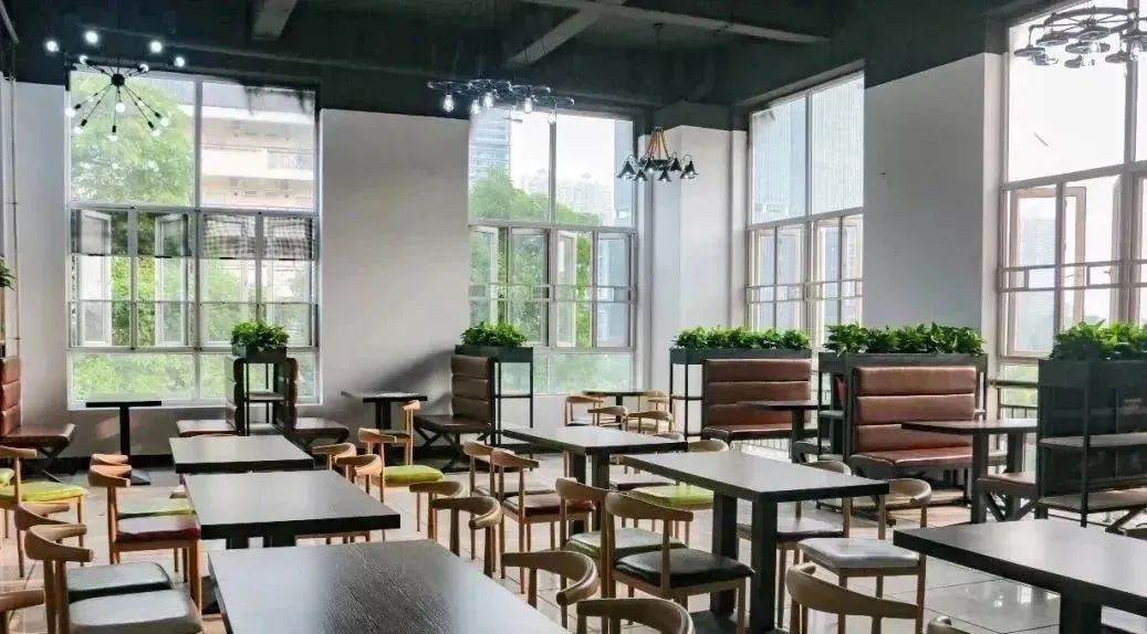 第二饭堂走工业风,硬朗的餐桌餐椅,搭配复古圆长桌,打造了独具特色的就餐氛围。