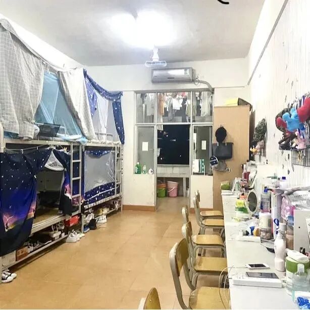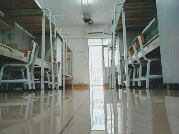 设备与条件:配有独立卫浴、阳台、桌子(3个人一排一起用)、风扇和空调,除了1-4栋宿舍没有电梯,其他宿舍楼都有两部电梯