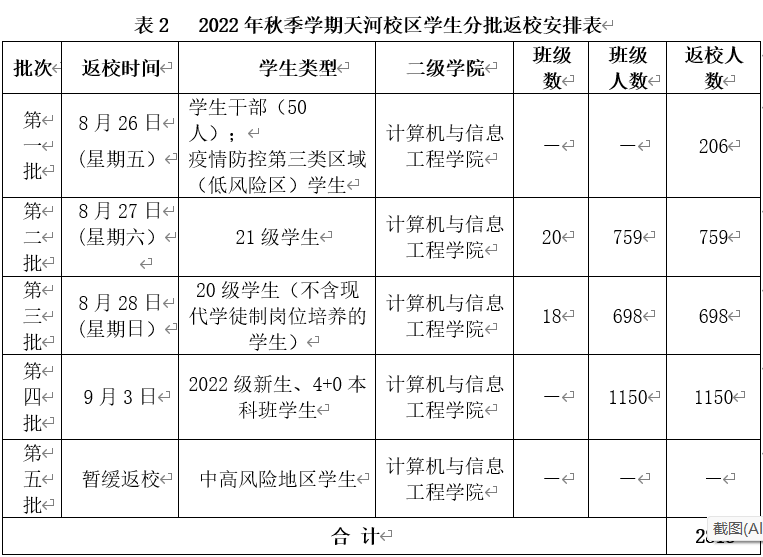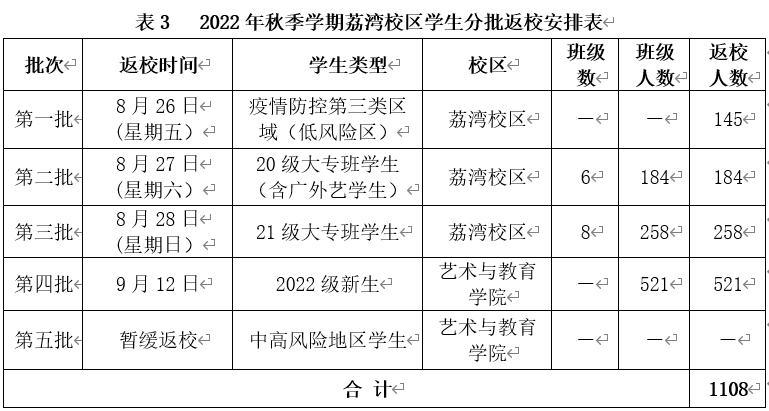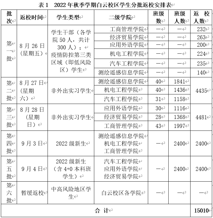 1.根据2022年秋季学期开学工作安排及教学计划,为落实疫情防控要求和避免人员聚集,学校组织学生按批次有序返校,白云校区分六批、天河校区分五批、荔湾校区分五批返校。各校区分批返校安排见表1、表2、表3。