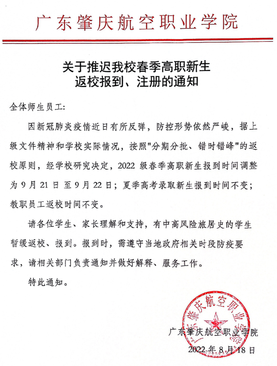 据广东肇庆航空职业学院招办官微18日消息,因新冠肺炎疫情近日有所反弹,防控形势依然严峻,经学校研究决定,2022级春季高职新生报到时间调整为 9 月 21 日 至 9 月 22 日;夏季高考录取新生报到时间不变;教职员工返校时间不变。