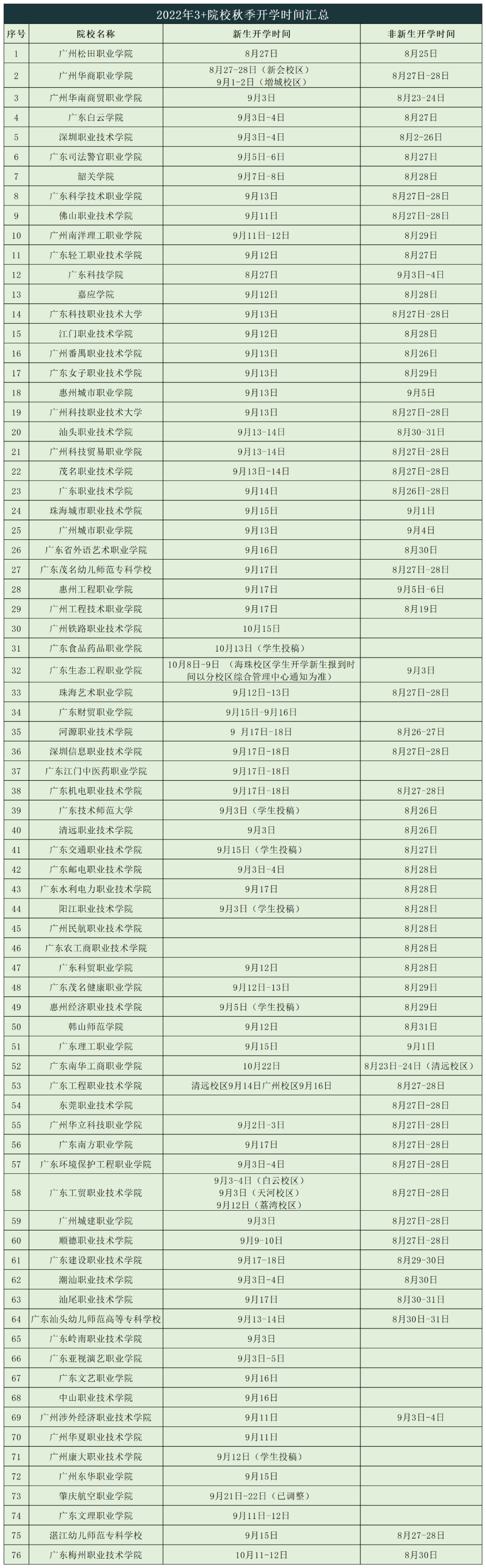 从收集的数据中,可以看出目前最晚开学的是广东南华工商学院10月22日才开学,10月份开学的还有广州铁路职业技术学院,广州食品药品职业学院等。可以在家美美享受中秋和国庆假期啦~