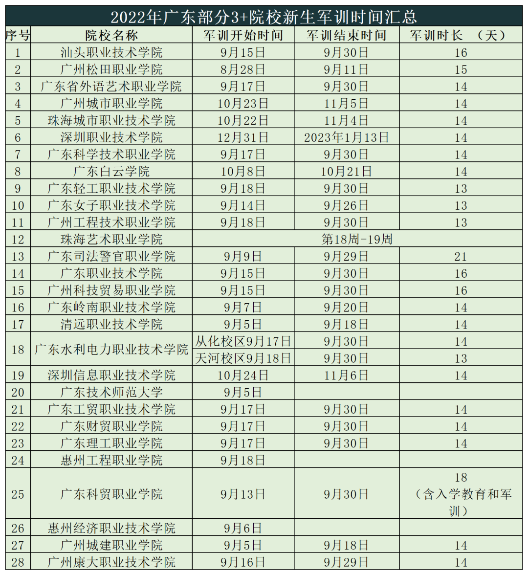 从收集到的数据来看,广州松田职业学院是最早军训的学校,从8月28日就开始军训了,其实也可以看出,由于开学时间比较早,因此军训的时间也会较早。