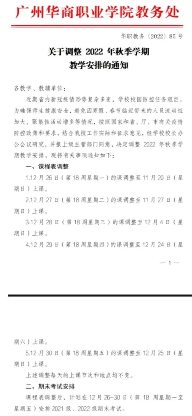 广州华商职院发布《关于调整2022年秋季学期教学安排的通知》,称受疫情影响,学校12月26-30日的课程提前,26-30日进行期末考试。