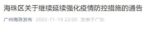 19日晚,广州市海珠区发布《关于继续延续强化疫情防控措施的通告》,其中提到,要将此前发布的强化疫情防控措施继续延续至11月22日24时。