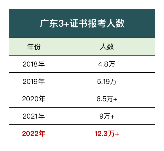 在广东省教育考试院公布的2022年完整的3+证书高职高考招生计划中,部分本科院校增加了招生专业,专科批次也有新增招生院校,对比往年招生人数、报名人数都有上升趋势。