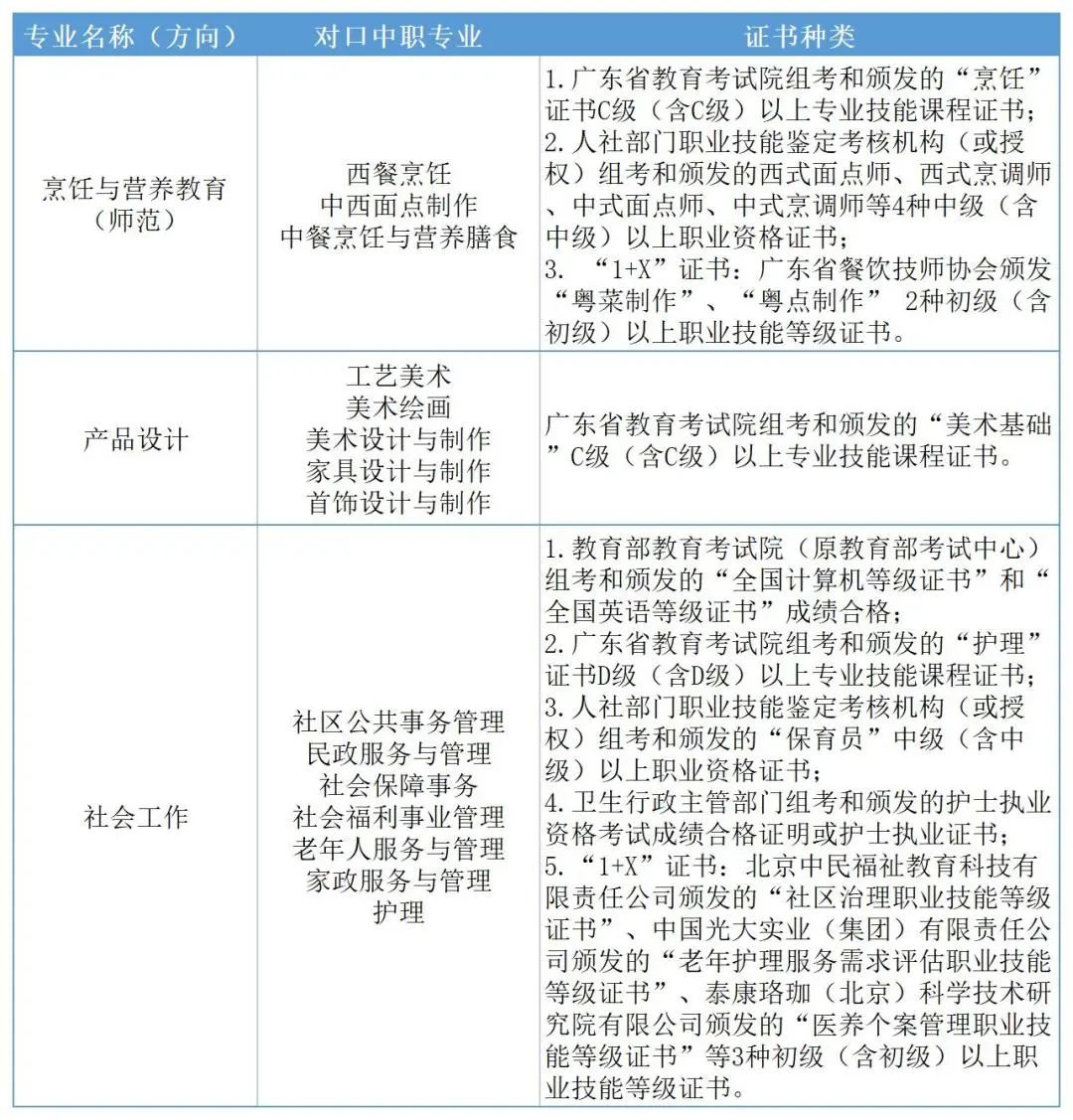 2.证书要求:广东省教育考试院组考和颁发的烹饪证书;人社部门职业技能鉴定考核机构(或授权)组考和颁发的西式面点师、西式烹调师、中式面点师、中式烹调师等4种中级及以上职业资格证书;广东省餐饮技师协会颁发“粤菜制作”、“粤点制作” 2种初级(含初级)以上“1+X”职业技能等级证书。