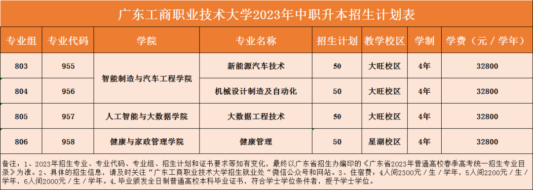 2023年广东工商职业技术大学面向中职生招收机械设计制造及自动化、大数据工程技术、新能源汽车工程技术、健康管理等4个本科专业,各专业计划招生50人,合计招生200人。