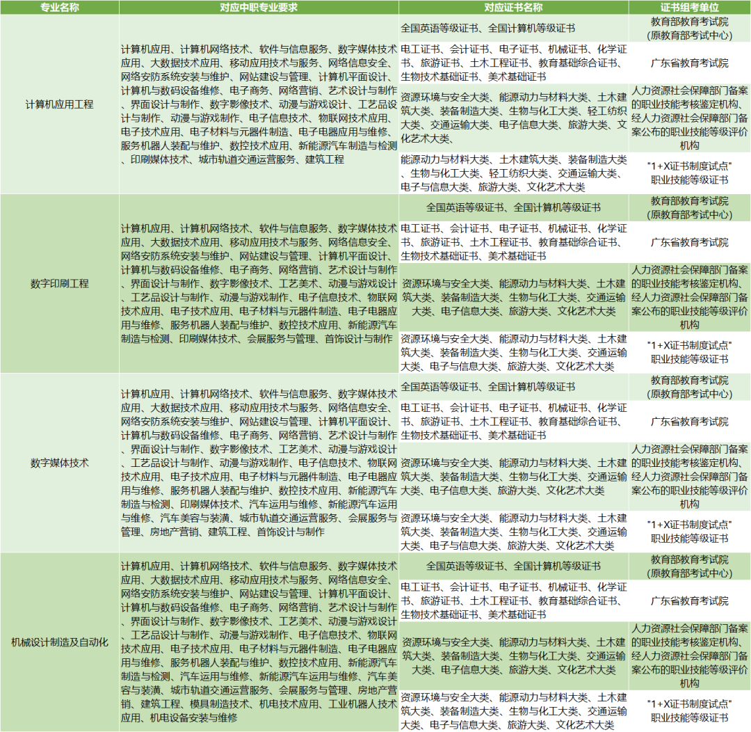 教育部考试中心组考的全国计算机等级证书 广东省教育考试院组考的电工、电子、机械、土木工程证书 人社部门职业技能鉴定考核机构(或授权)组考和颁发的制图员、建筑信息模型技术员、防水工、钢筋工、混凝土工、架子工、工程测量员、无人机测绘操控员、公路养护工、电工车工、铣工、模具工、焊工、钳工、机床装调维修工、无人机装调检修工、电梯安装维修工、制冷空调系统安装维修工、锻造工、制冷工、铸造工、汽车维修工、汽车装调工、广电和通信设备调试工、电工、工业机器人系统运维员信息通信网络运行管理员、网络与信息安全管理员、计算机程序设计员、区块链应用操作员、计算机维修工、工业机器人系统运维员、电子商务师、动画制作员中级及以上职业资格证书(已涵括土木建筑大类、装备制造大类、交通运输大类、电子信息大类所有资格证书) 职业教育培训评价组织组考和颁发的土木建筑大类、装备制造大类、交通运输大类、电子与信息大类的“1+X”职业证书 |