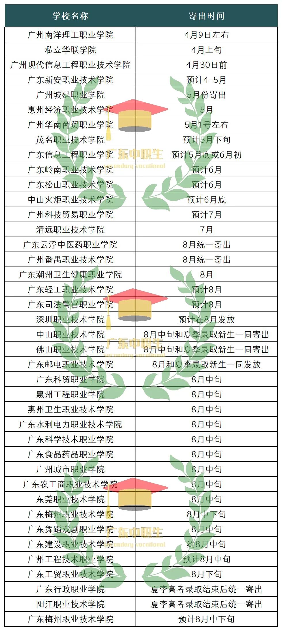 也有学校例外的,如茂名职业技术学院在5月下旬发出,广东松山职业技术学院在6月寄出,中山火炬职业技术学院预计6月底寄出。