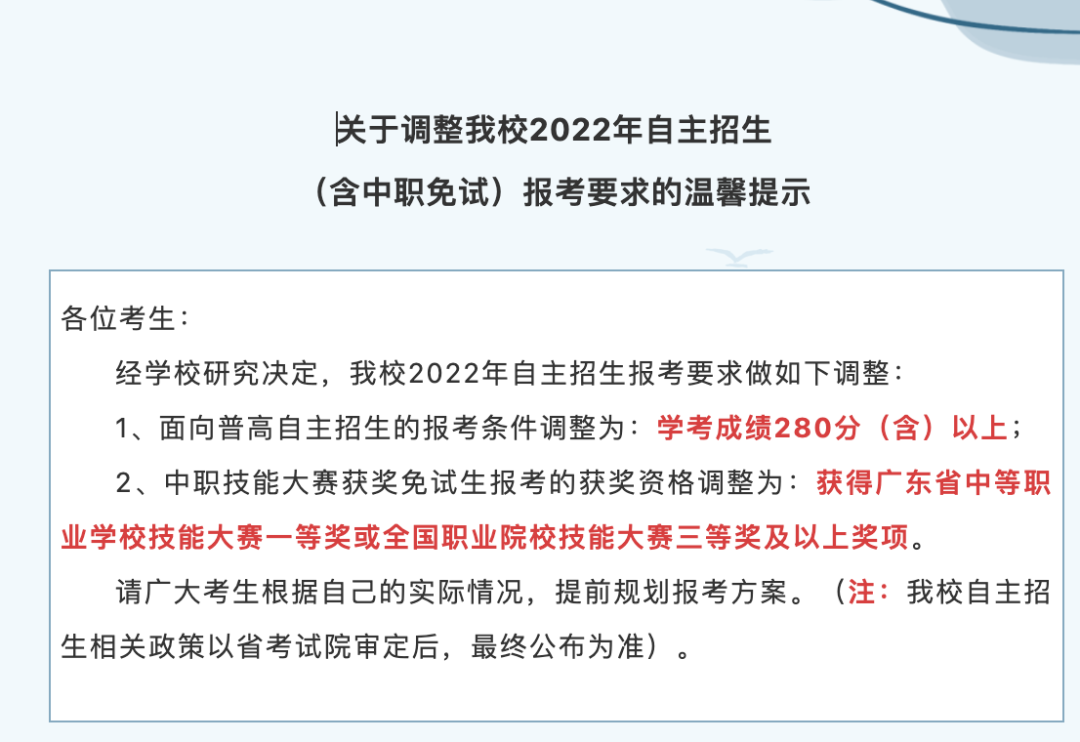 1.报考职业技能大赛获奖免试的考生须符合广东省招生委员会《关于做好广东省2022年普通高校招生统一考试报名工作的通知》(粤招〔2021〕7号)普通高考报名条件规定,并参加了广东省2022年普通高考报名。