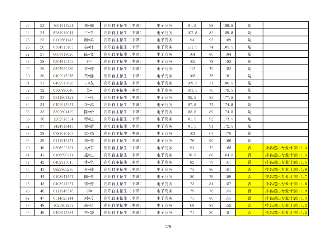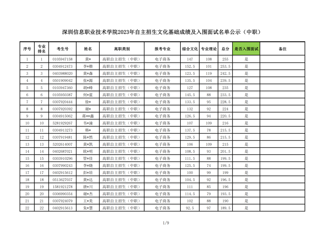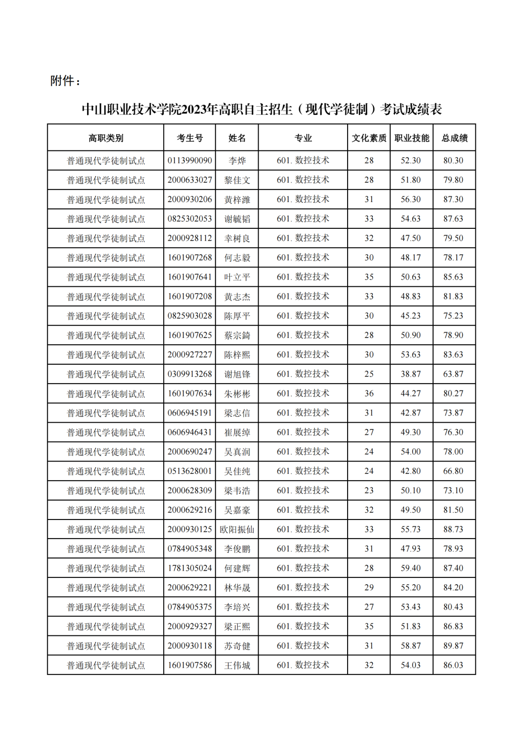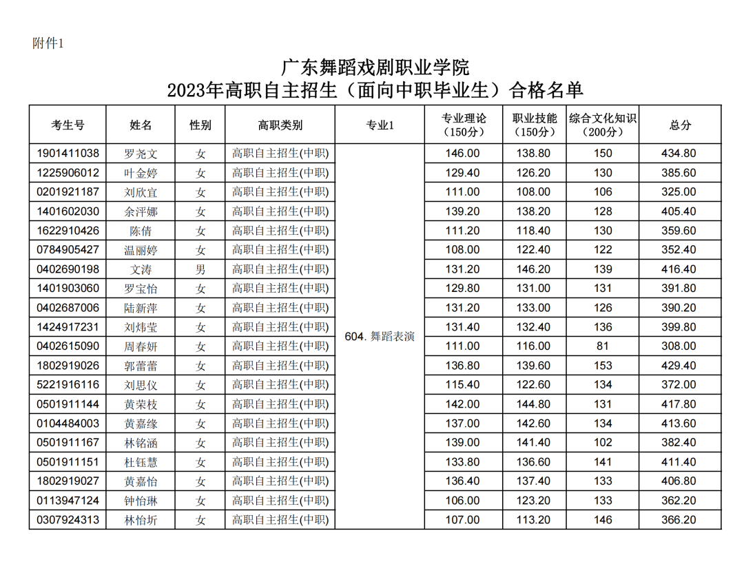 附件1:广东工贸职业技术学院2023年自主招生成绩公示名单