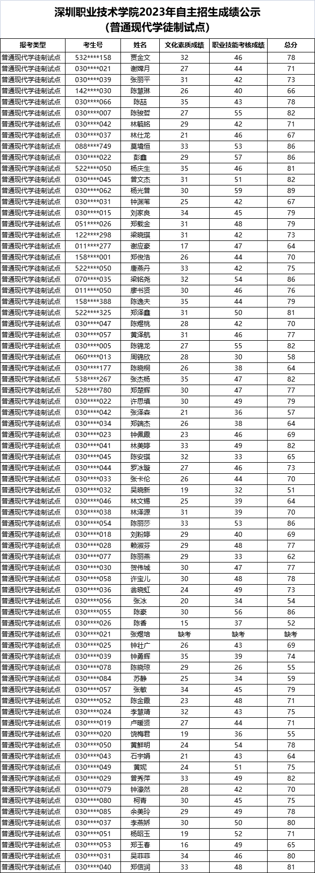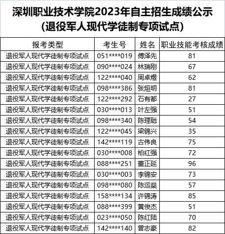 根据《教育部办公厅关于进一步完善高职院校分类考试工作的通知》(教学厅函〔2021〕36号)、《关于做好2023年高等职业院校自主招生工作的通知》(粤教考〔2023〕13号)等文件精神,我校自主招生考核、阅卷、登分等工作严格按照《广东工贸职业技术学院2023年自主招生招生简章》等实施方案执行,现将自主招生考生考核成绩予以公示(见附件1)。