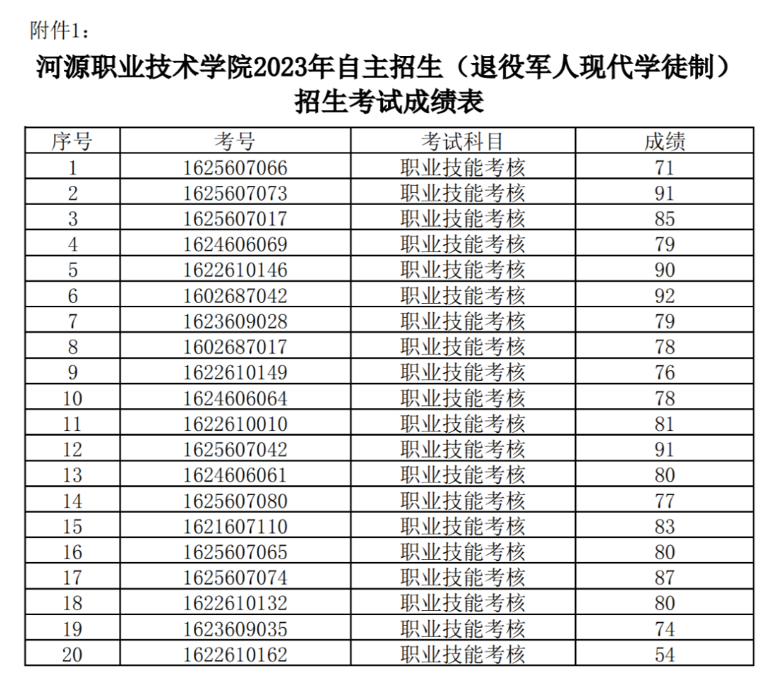 我校2023年自主招生(退役军人现代学徒制)考试评卷工作已全部完成,现将成绩予以公示(详见附件),公示期3日。如对本人当次考试成绩有异议,请于5月26日17:30前通过书面形式向我办提出复查成绩的申请(请下载附件填写),地址:河源市东环路河源职业技术学院教学楼A103招生办,电话(兼传真):0762-3800006。