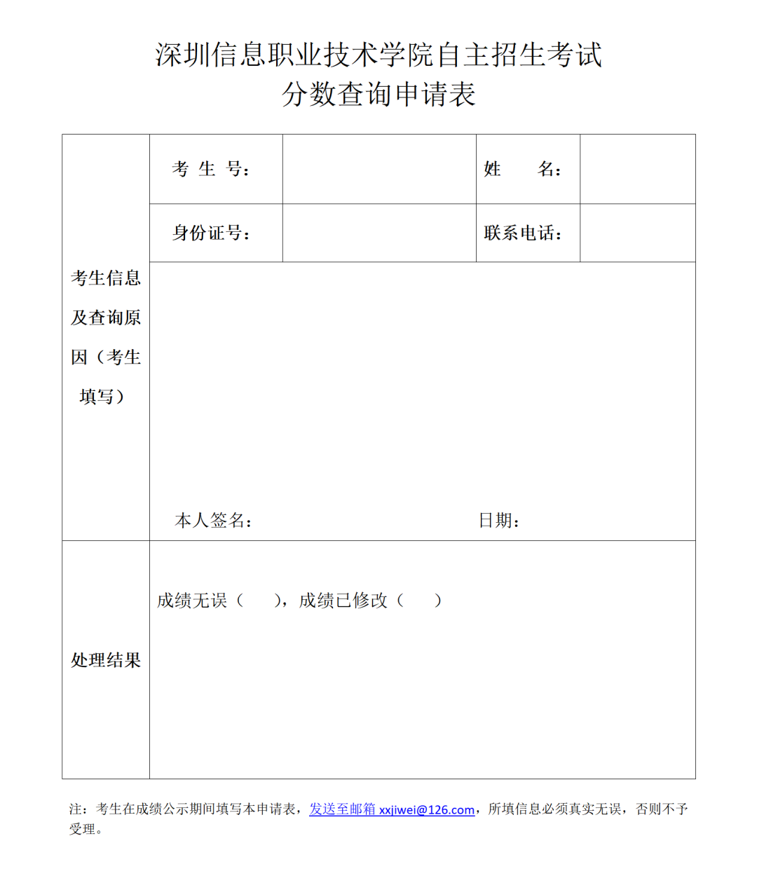 若考生对考试成绩有疑问,可于2023年5月25日12:00前向我校招生办公室提出书面申请复核成绩,查分申请需附上本人身份证正反面复印件(查分申请表和本人身份证正反面复印件请快递到我校招生办公室),材料不齐不予受理。