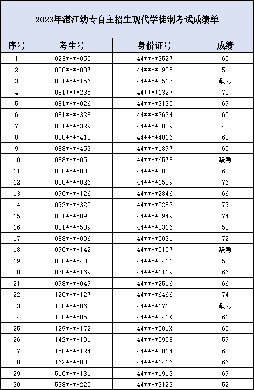 湛江幼儿师范专科学校2023年自主招生普通现代学徒制招生考试已结束,现向社会公示2023年普通现代学徒制试点自主招生考试成绩(详见下图)。公示期内,如对成绩有异议,可以通过电话或电子邮件向我校反映。