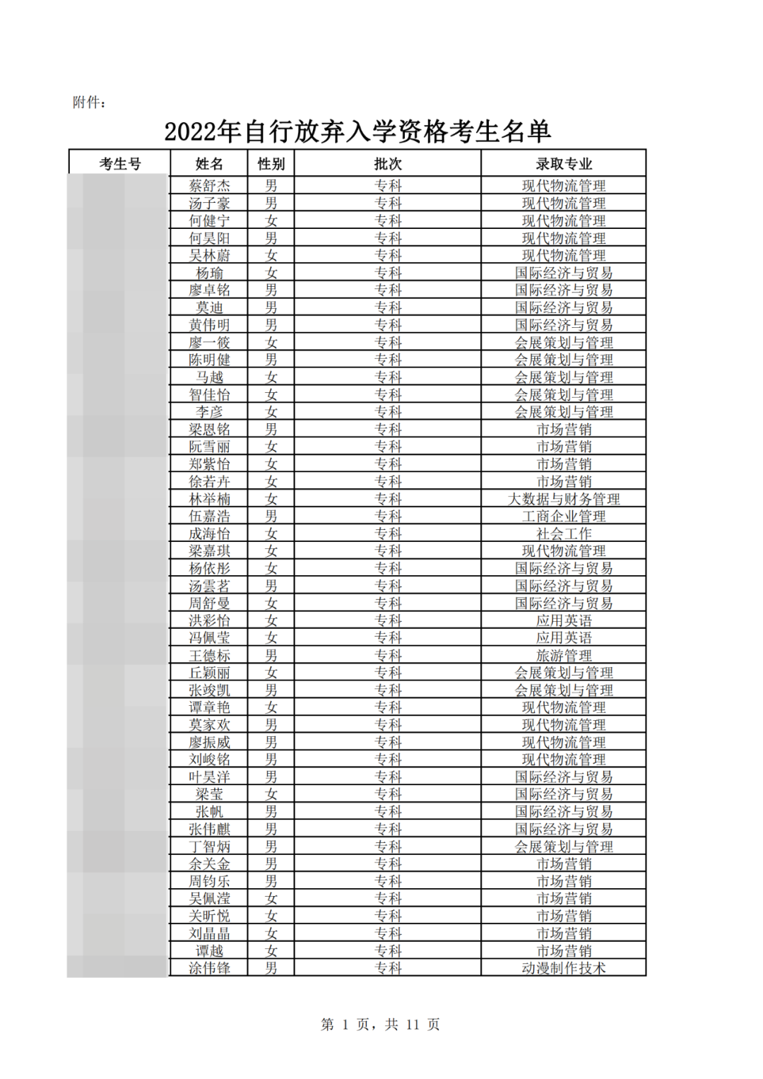 根据广东省招生委员会《关于做好2022年广东省普通高等学校录取新生报到工作的通知》(粤招办普〔2022〕45号)精神,我校规范做好2022级新生入学资格复查工作。截止11月14日,我校2022年广东省录取的531名新生未到校报到注册,按照文件规定,该批考生将视为自行放弃入学资格,为保证考生权益,现将2022年自行放弃入学资格考生名单(见附件)予以公示。