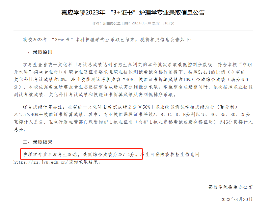 护理学专业录取考生30名,最低综合成绩为287.4分。