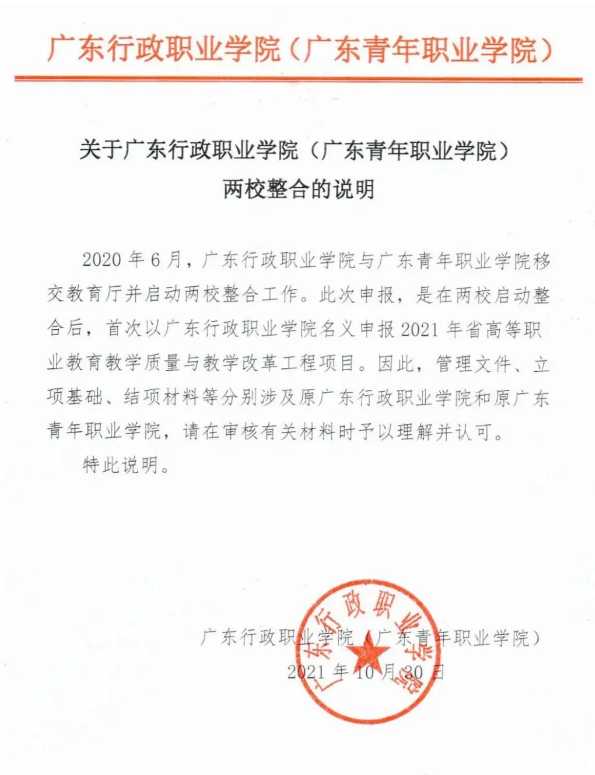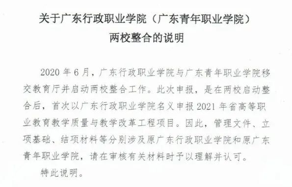 其实早在2021年10月,学校官网发布整合声明,称广东行政职业学院与广东青年职业学院在2020年6月已启动两校整合工作