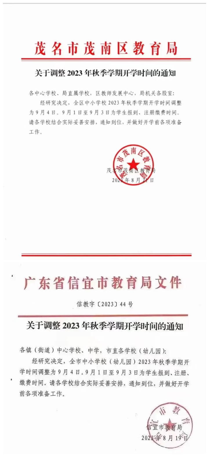 除了普宁的,广东也有两个地方发布推迟开学的通知,茂名信宜市和茂南区也先后调整了开学时间,开学时间也调整为9月4日。