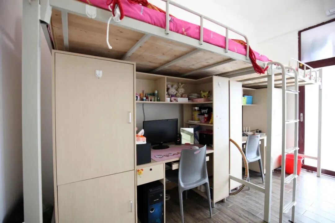 宿舍上床下桌,主色调为淡绿色。每个位置都拥有单独的衣柜,书桌储物空间也足够