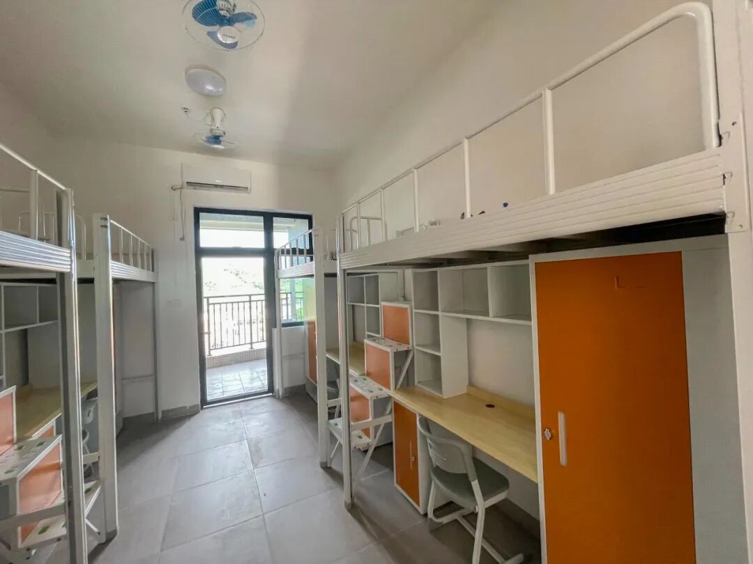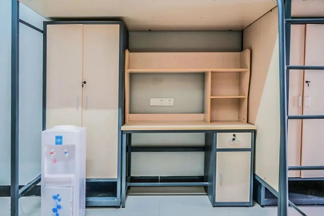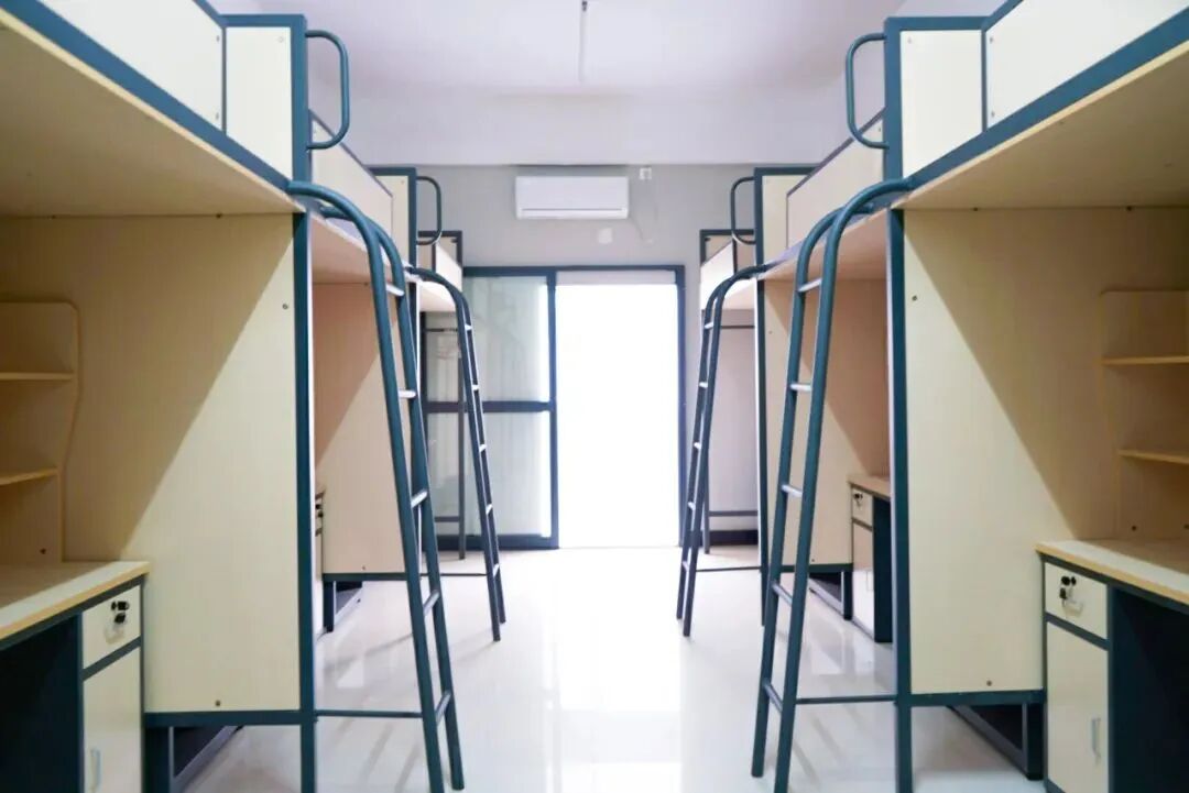 学生宿舍宽敞明亮,床铺设有梯柜,方便学生上下,还可以增加储物空间。