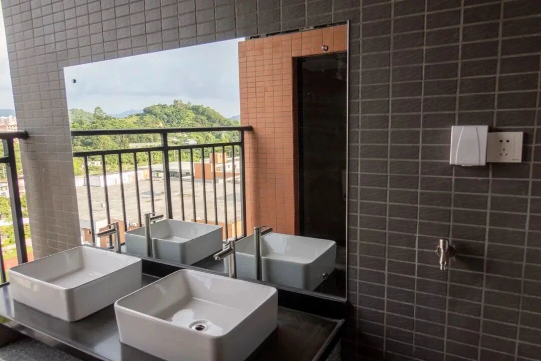 每间宿舍内安装了两台风扇、一台空调,为上床下桌格局,住宿区到阳台是全透明。阳台不仅有两个洗手池,还有一面硕大的镜子,对于四个人的宿舍可以说是绰绰有余。