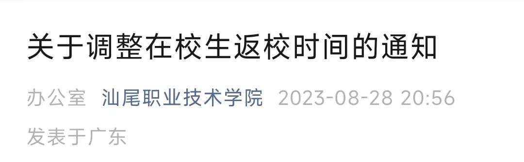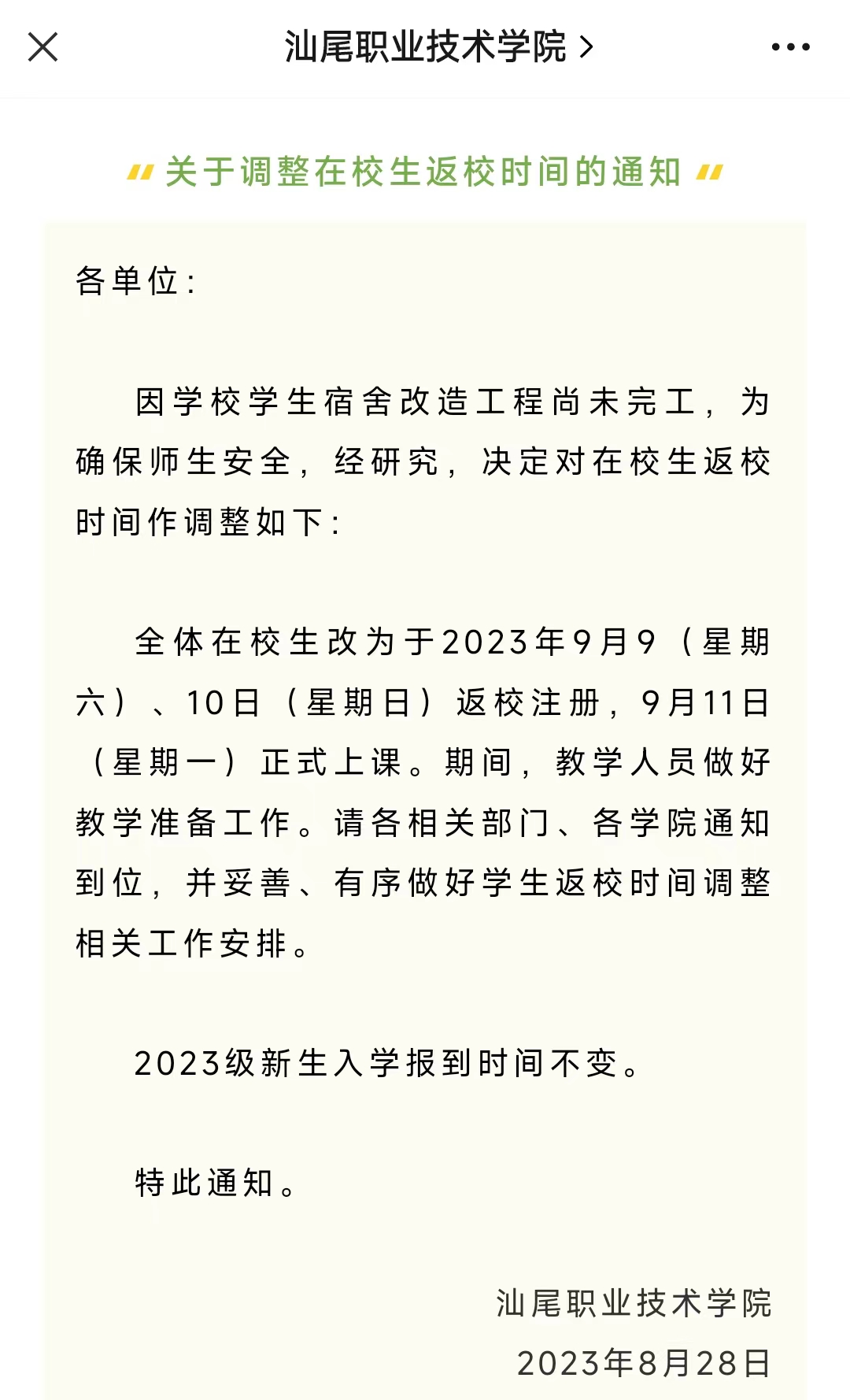 28日,汕尾职业技术学院发布通知,因学校学生宿舍改造工程尚未完工,决定对在校生返校时间作调整如下: