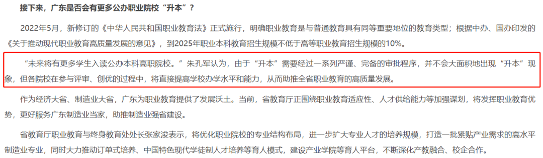 早前,广东省教育厅上线广东“民声热线”节目,其中也就“广东是否会有更多公办职业院校‘升本’?”进行回应: