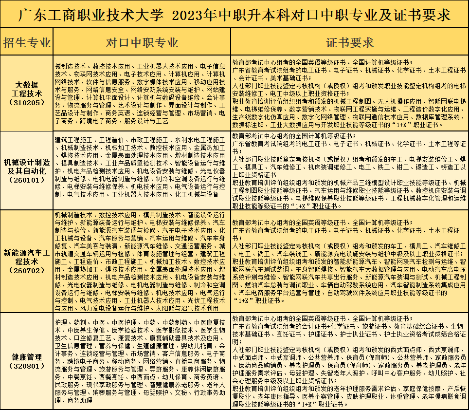 各专业技能测试的情况及录取最低分:根据学校官网发布的《广东工商职业技术大学2023年本科层次招收中职毕业生职业技能测试合格线及成绩公示》广东工商职业技术大学2023年本科层次招收中职毕业生职业技能测试合格线如下: