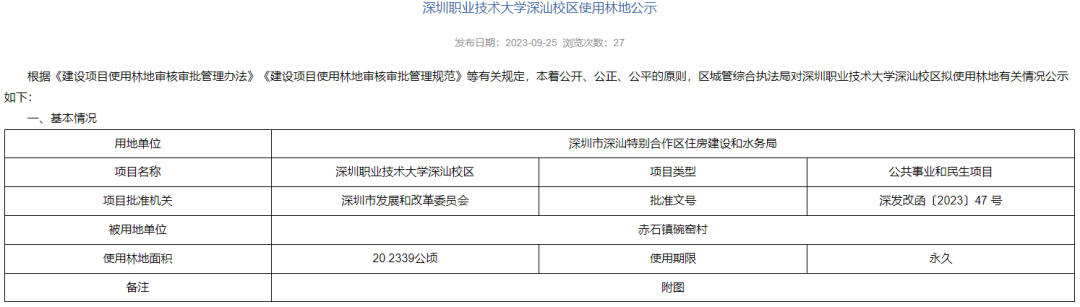 9月25日,深圳市深汕特别合作区党工委、管委会发文“深圳职业技术大学深汕校区使用林地公示”。