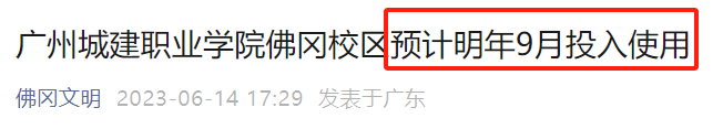 广州城建职业学院佛冈校区首期工程已于2021年9月动工,总建筑面积约24万平方米,可容纳在校生规模约4000人。