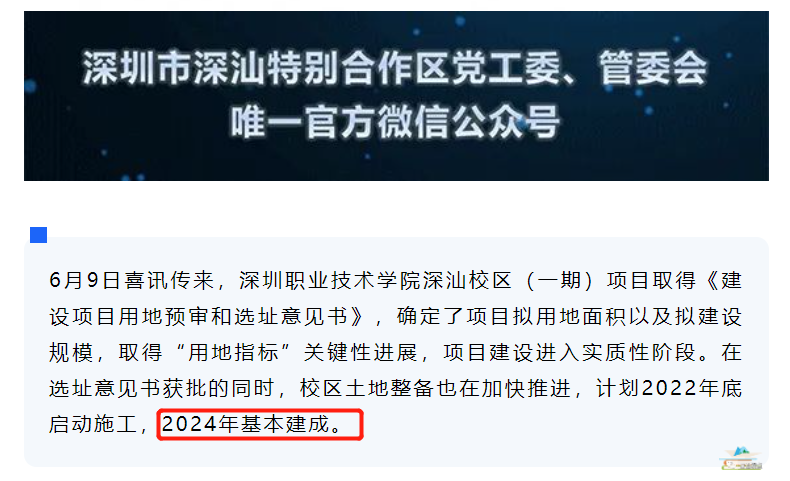 深圳信息职业技术学院深汕校区(简称“深信院深汕校区”)由深圳市深汕特别合作区管理委员会与学校共建,致力于成为辐射粤东的应用型高等院校。2020年,深圳信息职业技术学院深汕校区筹建办公室揭牌。